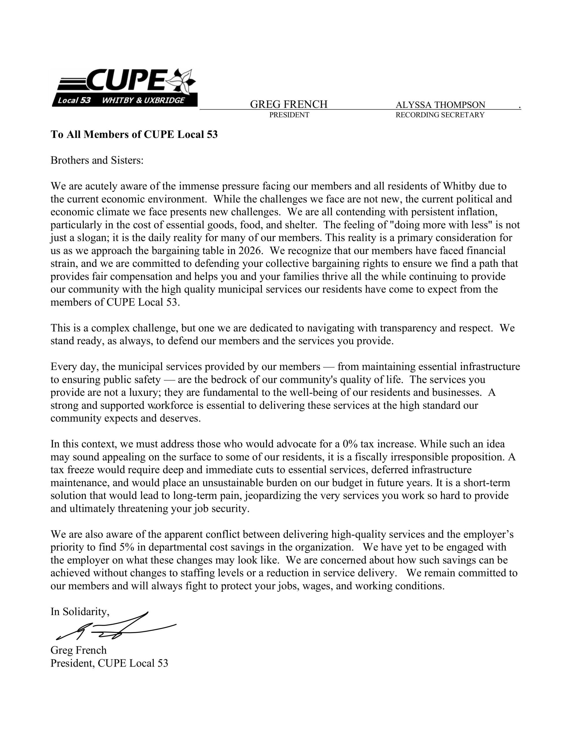 CUPE 53 Response to Recent Budget Comments from the Employer September 29, 2025 Good morning CUPE 53 Members! Please read the following statement from CUPE Local 53 President Greg French.
